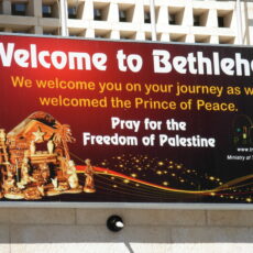 Das Foto zeigt ein Willkommensplakat des Tourismusbüros in Bethlehem.