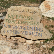 Das Foto zeigt einen Motto-Stein am Eingang zu Daoud Nassars Weinberg. Auf der Homepage des Projektes "Tent of nations" heißt es: