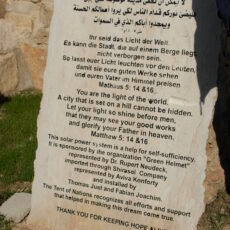 Das Foto zeigt einen Gedenkstein in Dahers Weinberg (siehe 10. Dezember), der sich für die Spende einer Solaranlage durch Rupert Neudecks Hilfsorganisation bedankt. Denn die israelische Behörde verweigert nicht nur das Bauen auf dem Hügel sondern auch den Anschluss an das öffentliche Strom- und Wassernetz.