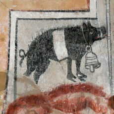 Ikonographische Attribute des heiligen Antonius (Detail einer Darstellung in Murau): Schwein und Glocke (Foto: Wolfgang Sauber)